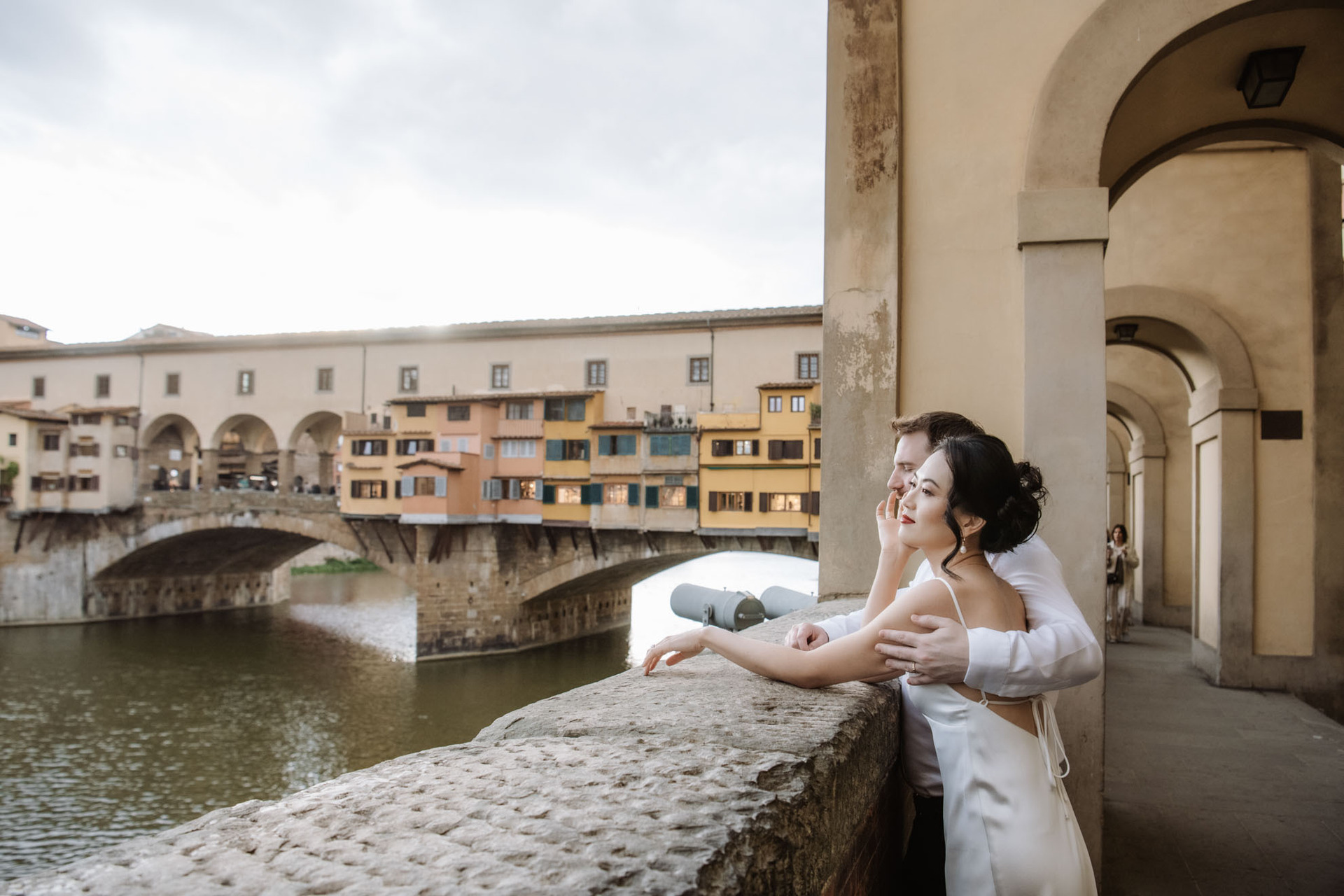 In the days leading up to their wedding, Sera and Jared chose to celebrate their love with a romantic pre-wedding photo session in Florence. We wandered through the city’s most iconic locations, including the Ponte Vecchio, Piazza della Signoria, and the Lungarno, capturing intimate moments as the afternoon sunlight faded into the warm hues of sunset. These timeless photographs tell the story of their connection, set against Florence’s historic beauty.
