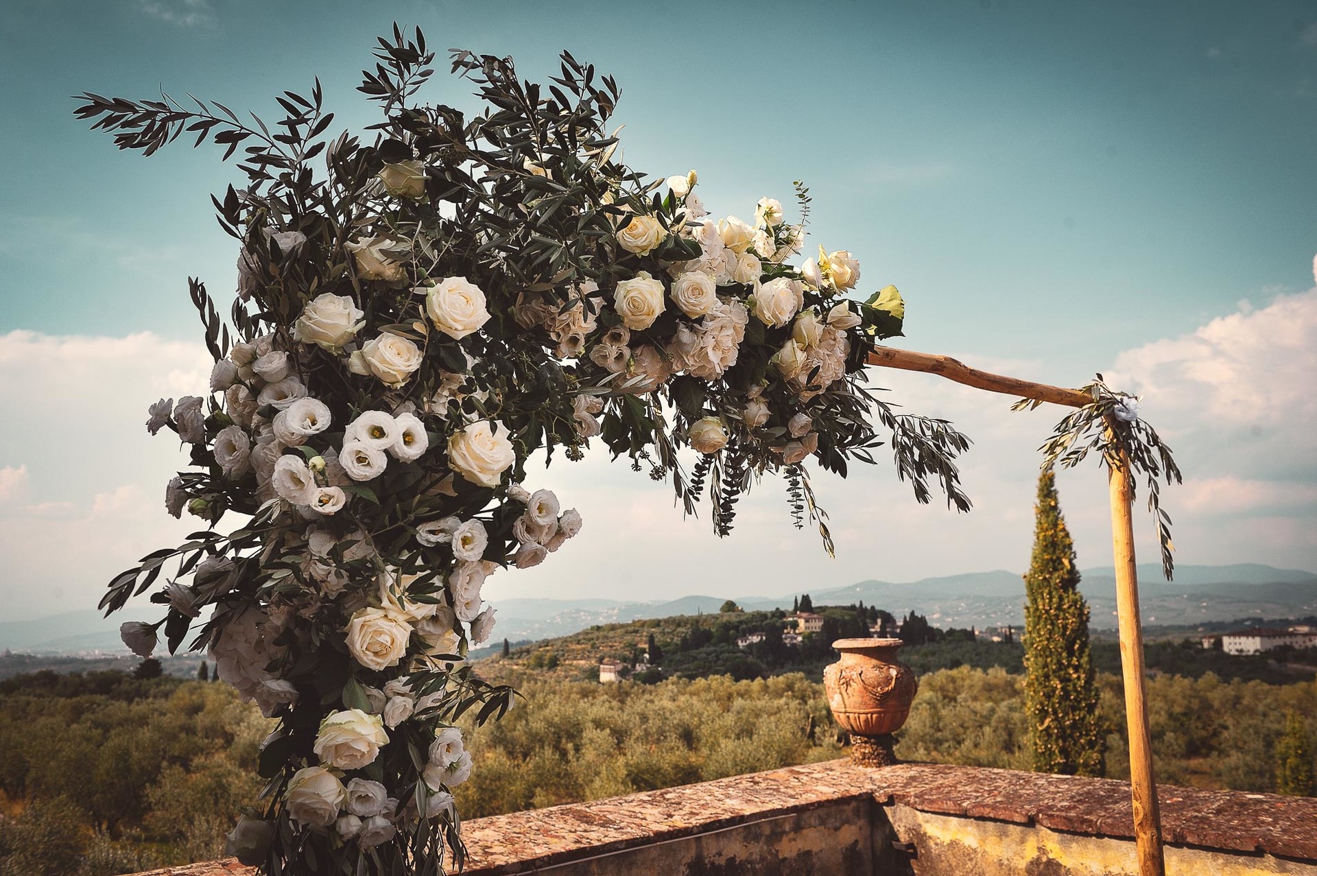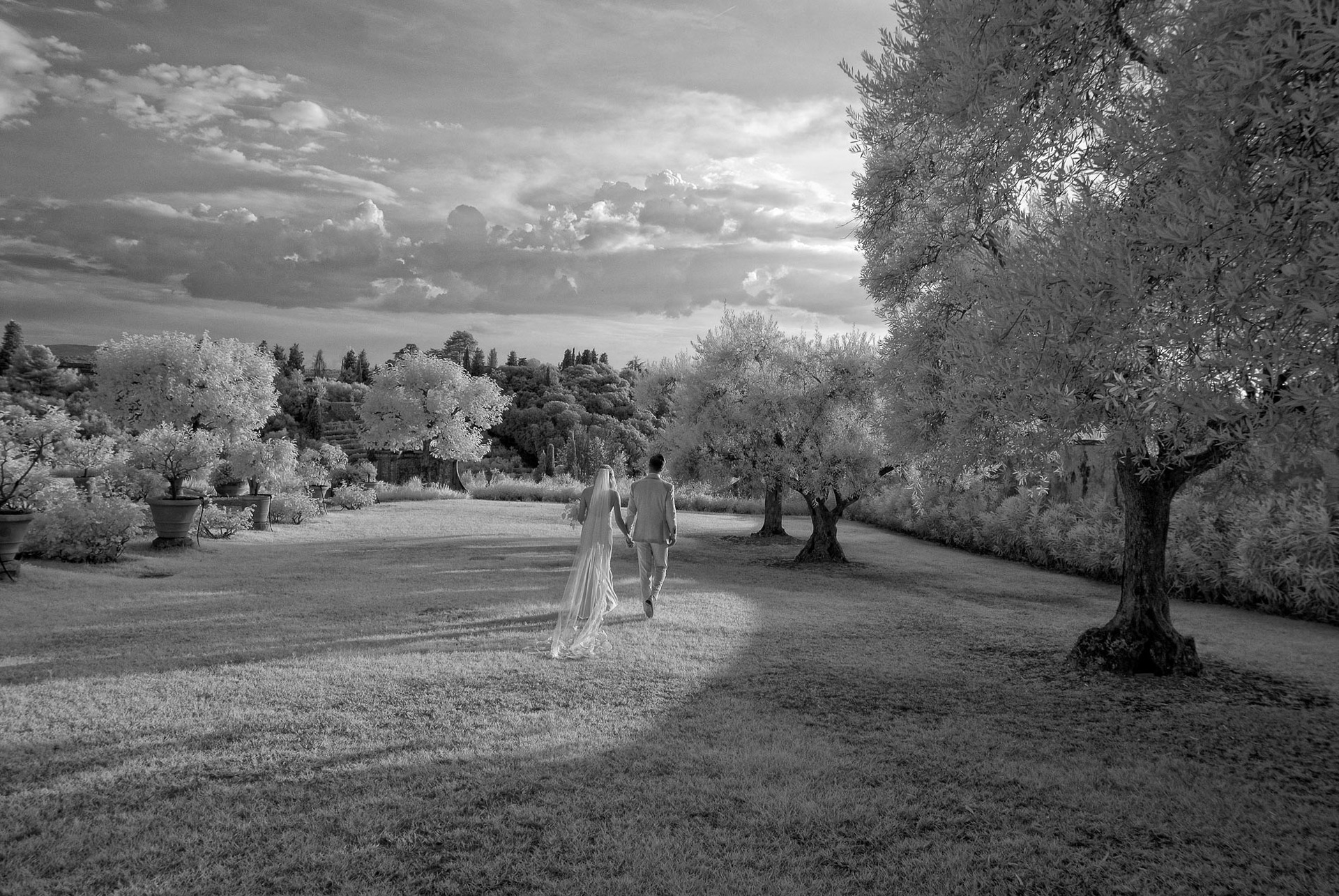 From the United States to Italy for their wedding in the splendid setting of the Villa Medicea of Lilliano, on the hills around Florence. A wedding ceremony celebrated on the beautiful terrace of the Villa Medicea of Lilliano with a view of Tuscany dominating the Duomo of Florence. The reception in the garden of the Villa Medicea of Lilliano with lights that have created a magical atmosphere. Guests and spouses enjoyed the wedding drinking the good red wine of the Malenchini company, owners of the Villa Medicea of Lilliano, and they enjoy a good menu typical of Tuscany. For the photography session I moved naturally and spontaneously taking advantage of the beauty of the Villa Medicea of Lilliano. I used an infrared photography and I also took advantage of the blue hour for some amazing wedding photos.